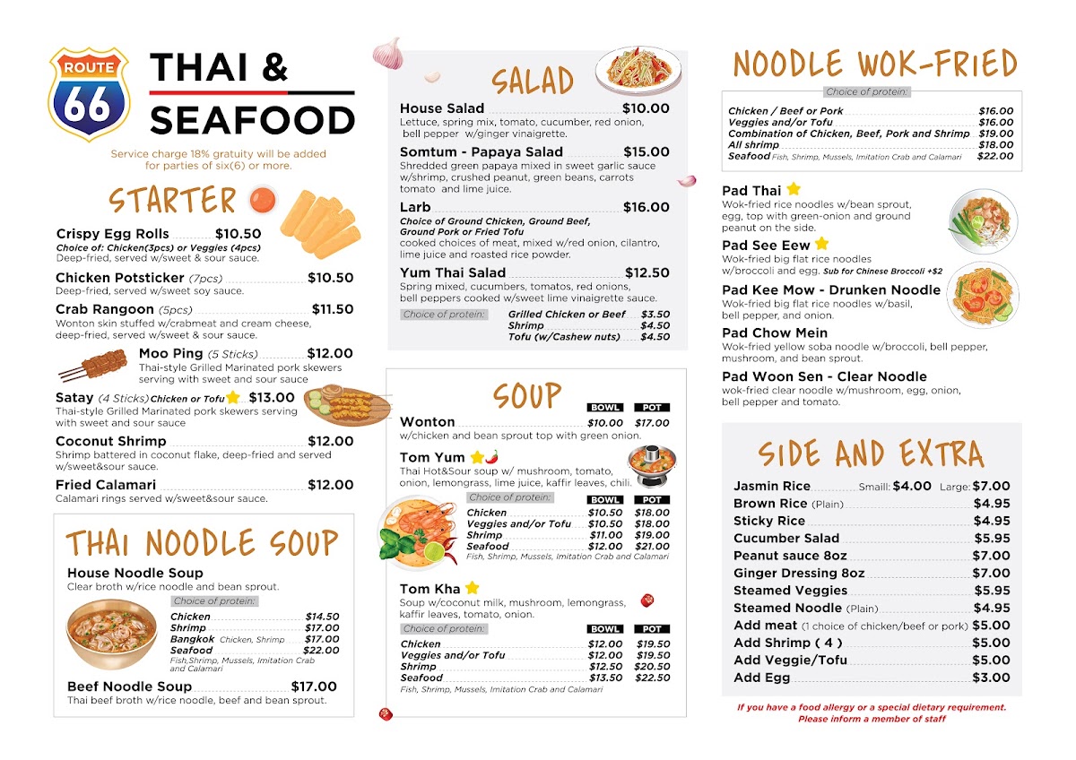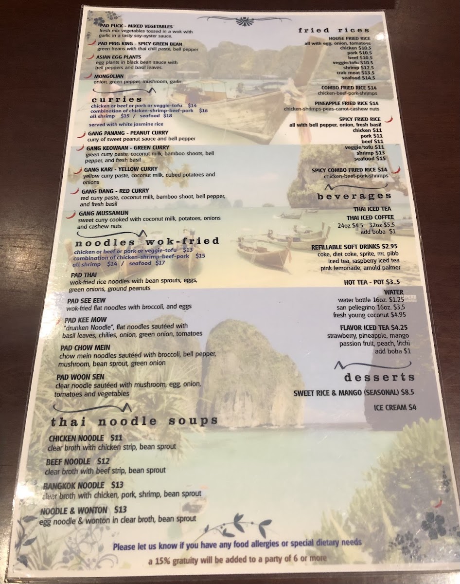 As for beverages, don’t miss the chance to sip on their refreshing **Thai Iced Tea**, rich and creamy, or the **Flavored Iced Teas** that come in delightful options like strawberry and mango. Whether paired with your meal or enjoyed on its own, these drinks are an excellent way to cool off and complement your dining experience.