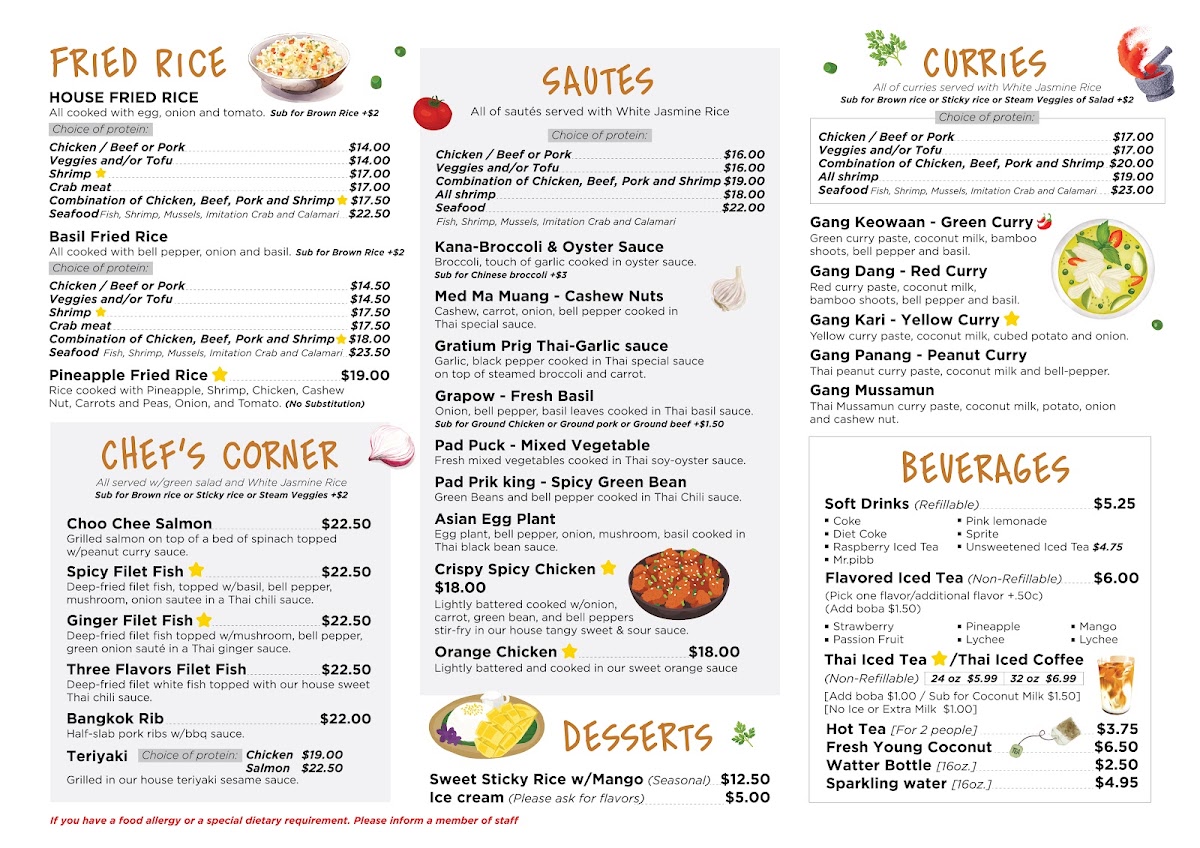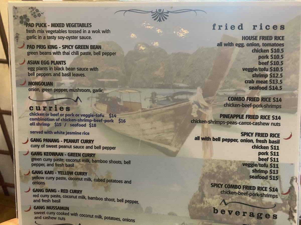 For curry lovers, be sure to indulge in one of their expertly crafted curries. The **Gang Kari** offers a comforting embrace of yellow curry infused with coconut milk and tender cubed potatoes. If you're in the mood for something sweet and nutty, the **Gang Panang** peanut curry will leave you craving more, while the **Gang Keow Wan** (Green Curry) excites the palate with its spicy kick and fresh basil notes. Each dish is a testament to the restaurant’s dedication to flavor and authenticity.